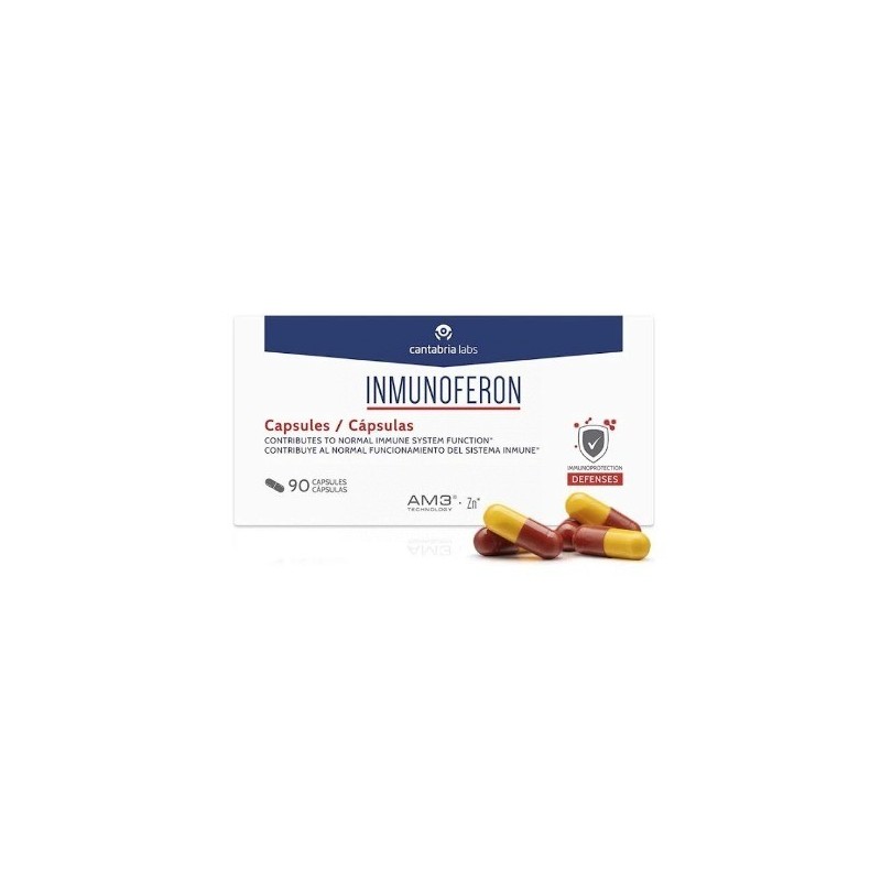 INMUNOFERON es un complemento alimenticio con una fórmula exclusiva a base de AM3® (alfa glucomanano fosforilado y proteína de soja), tecnología patentada por Cantabria Labs, y zinc, ingrediente que contribuye al normal funcionamiento del sistema inmune.