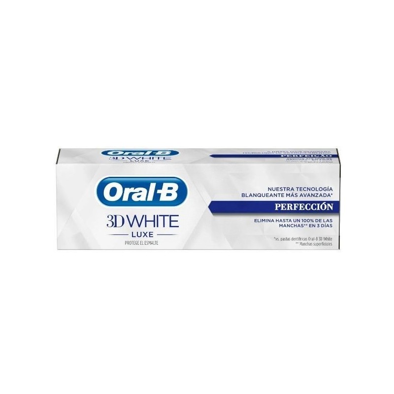 Prueba la pasta de dientes Oral-B 3D White Luxe Perfección de Oral-B, una tecnología para el blanqueamiento dental más avanzada y efectiva que la pasta de dientes Oral-B 3D White de Oral-B. Su innovadora fórmula cuida el esmalte y embellece tu sonrisa gracias a una tecnología basada en partículas que desincrusta y disuelve las manchas superficiales de los dientes y evita la aparición de nuevas manchas. Disfruta también del refrescante sabor de esta pasta de dientes, que potencia el frescor y deja una agradable sensación que perdura tras su uso. Elimina hasta el 100% de las manchas superficiales en 3 días. La tecnología de blanqueamiento más rápida y avanzada de Oral-B. Unas innovadoras partículas que desincrustan y disuelven las manchas superficiales de los dientes y evitan la aparición de nuevas manchas. Fórmula que cuida el esmalte. Un refrescante sabor a menta que potencia el frescor y deja una agradable sensación que perdura tras su uso.